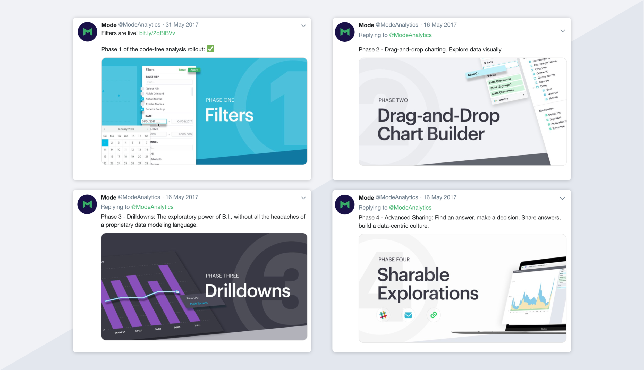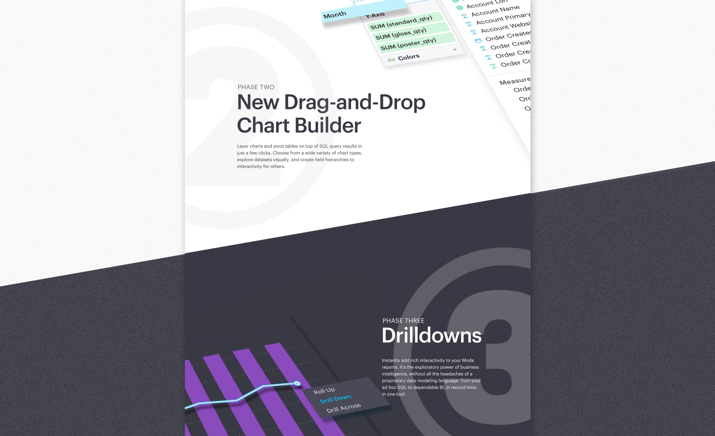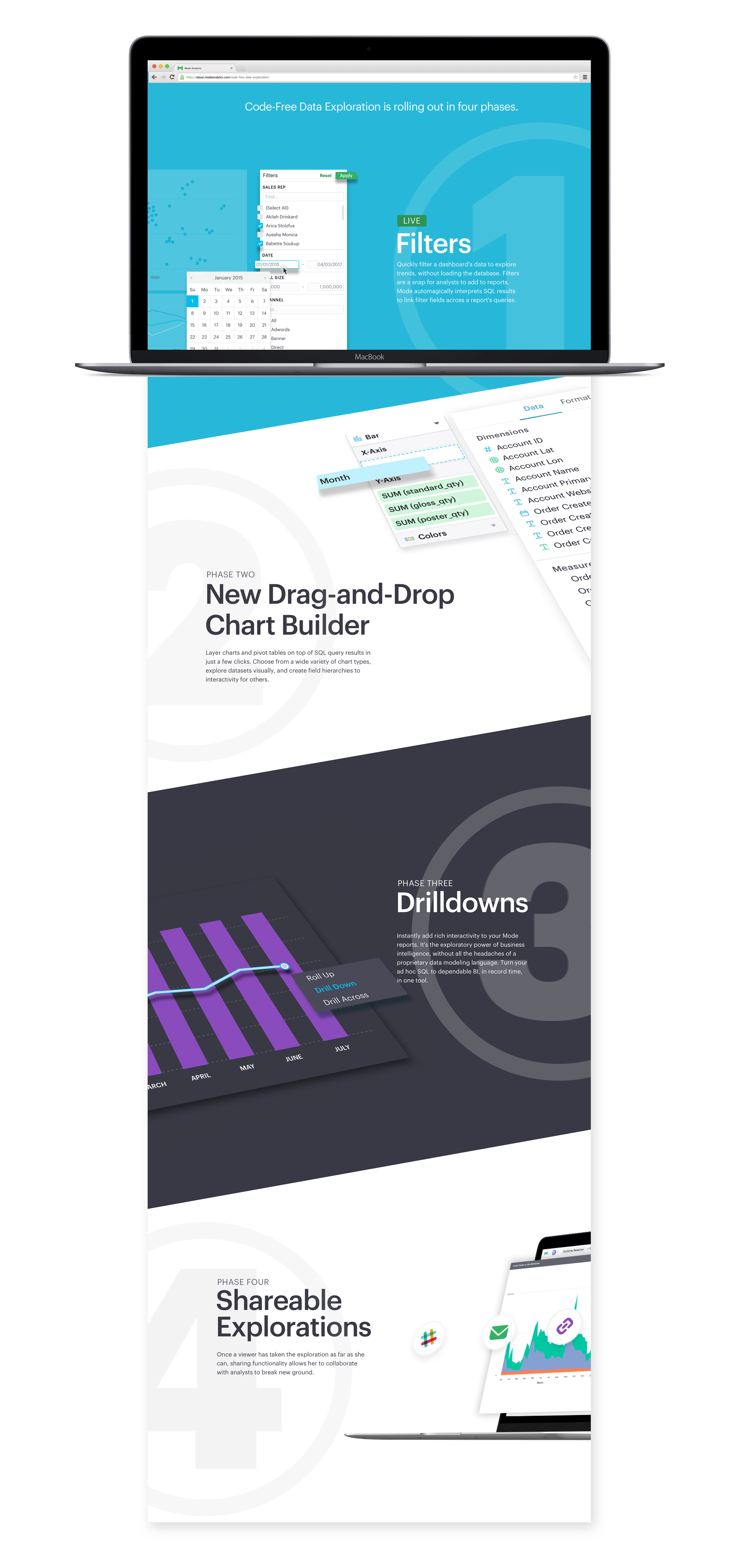 Mode Analytics is a BI tool which announced a highly anticipated launch in May: Code-Free exploration. Our goals were to excite customers about this 4-phase launch (over the course of 4 months) and drive requests for early access.